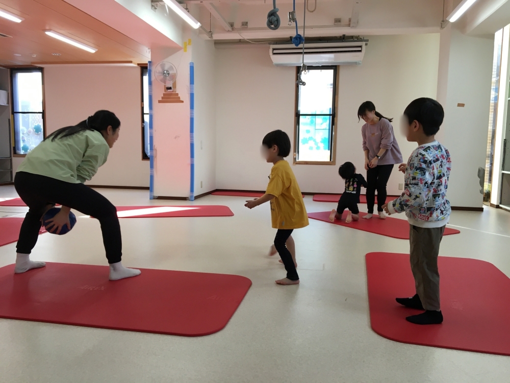 きっかけは、トランポリンを跳んでいたお友だちが大人に「キャッチして!」と自分の履いていた靴下を投げ、キャッチボールをしていると他のお友だちも“おもしろそう!”と自分の靴下を取りに行き、大人対子どものキャッチボールが始まりました。それだけでも楽しかったのですが、お友だちと協力しあそび合うきっかけにしようと思い、紙玉で作った大きなボールを用意し、大人に取られないようにパスをし合うあそびにしました。「こっちにパスして!」「○○くん!いくで!」とお友だちに呼びかけて渡す姿が増えてきましたが、動きながらのパスは、投げるではなく直接渡す形になっていました。体を止めて大人の動きを見てパスしたり、誰に投げるか?転がすか、投げるか?など安心して考える間を作れるように、マット1枚に1人ずつというスペースを作ってあそぶようにしました。